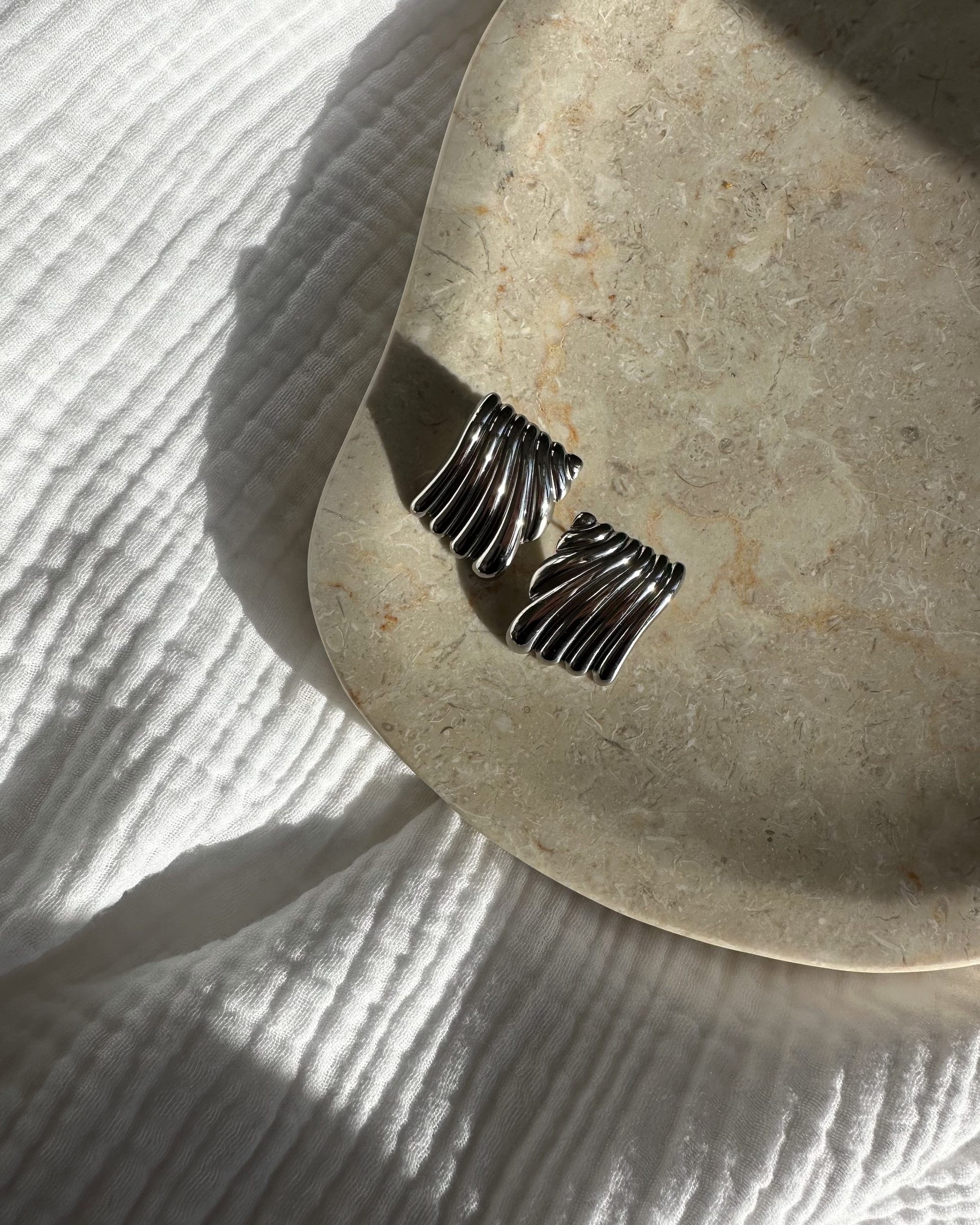 Våra örhängen är tillverkade i rostfritt stål med 18K PVD-plätering. Ett slitstarkt material som behåller sin färg och lyster över tid.